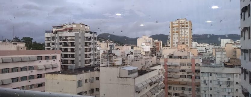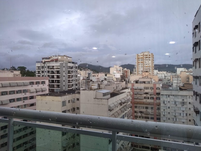 Chove lá fora.