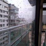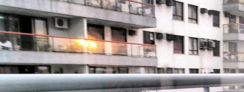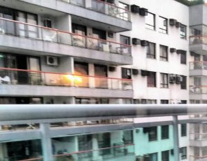 Na vidraça do prédio da frente